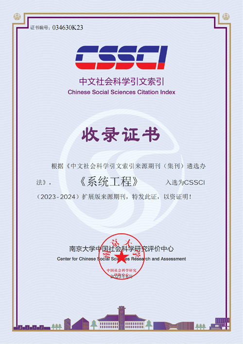 近日,接到南京大学中国社会科学研究评价中心通知,根据《中文社会科学引文索引来源期刊(集刊)遴选办法》,《系统工程》入选为CSSCI(2023-2024)扩展版来源期刊,这是《系统工程》继2010年入选CSSCI来源期刊后第六次入选该来源期刊。